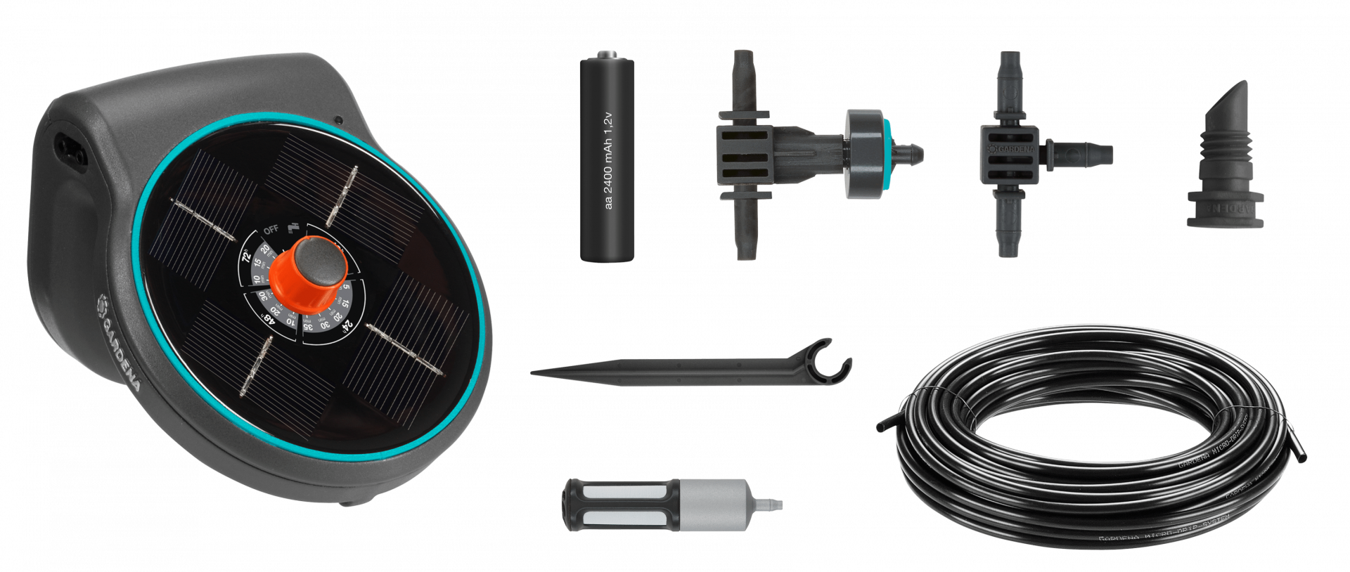 1 x vezérlőegység beépített szivattyúval és napelemmel, 20 x 0,5 l/óra nyomáskiegyenlítős sorcsepegtető, 15 x 3/16" csőtartó, 3 x újratöthető AA akkumulátor 1,2 V 2400 mAh, 8 x 3/16" T-elem, 8 x 3/16" csatlakozó, 1 x szűrő, 20 m 3/16" cső.